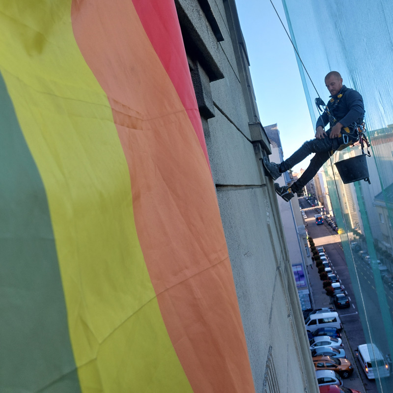 Reklám molinók, cégtáblák és dekorációk kihelyezése épületekre és ipari létesítményekre, alpintechnikával.